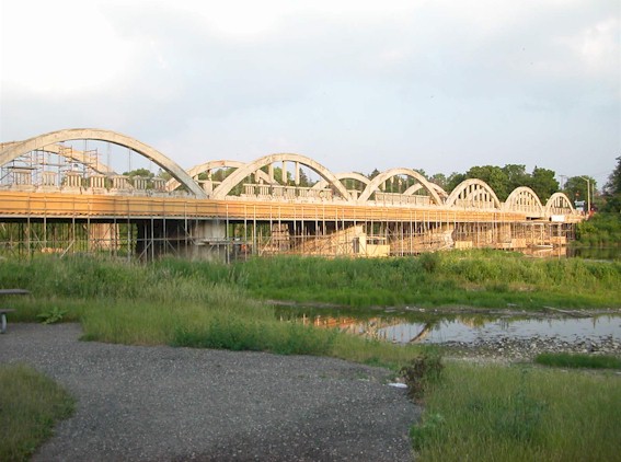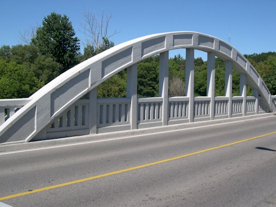 spans the Grand River, on a former alignment of Hwy 6 in Caledonia. The Caledonia Bridge boasts nine impressive bowstring spans. (Photograph taken on August 24, 2005 - © Cameron Bevers) Right - The Freeport Bridge was fully restored in 2003. The reconstruction project was particularly notable because an unprecedented amount of attention was paid to the fine details of this bridge. The entire bridge was restored precisely to its original appearance, including the embossed concrete arches, shown here. (Photograph taken on August 24, 2005 - © Cameron Bevers)