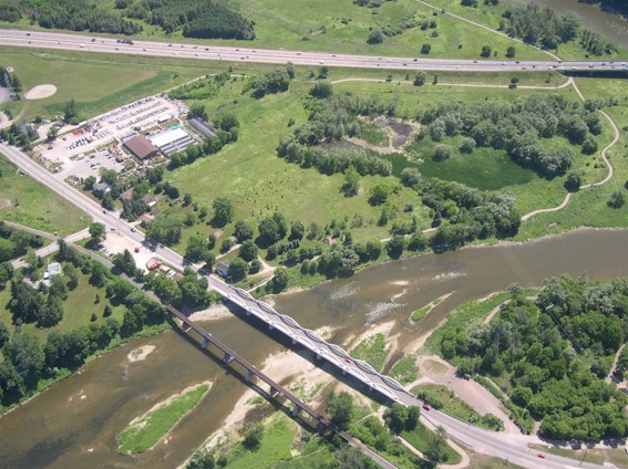 Left - Aerial view of reconstructed Freeport Bridge on Old Hwy 8 between Kitchener and
