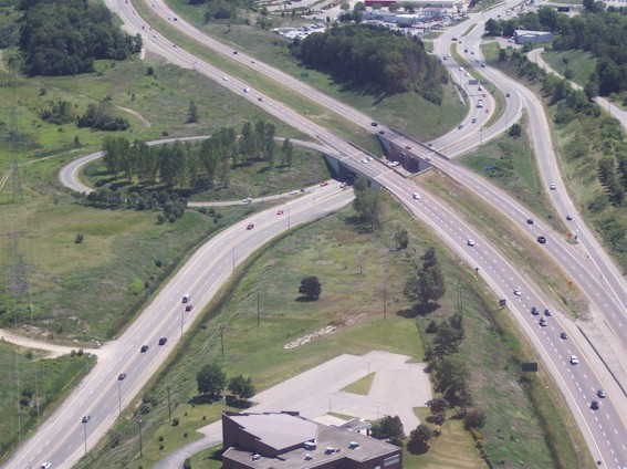 Left - Aerial view of Hwy 8 and King Street Interchange in Kitchener, facing south. Note the abandoned Hwy 8 alignment