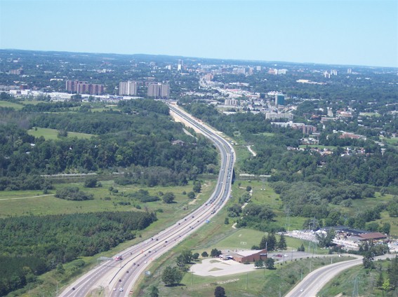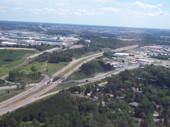Cambridge. Note the new route of Hwy 8 (Freeport Diversion) at the top of the photo. (Photograph taken on June 22, 2005 - © Cameron Bevers) Right - Aerial view of Hwy 8 facing west from King Street Interchange in Kitchener (Photograph taken on August 1, 2006 - Photo courtesy of Mike Witmer © 2006)