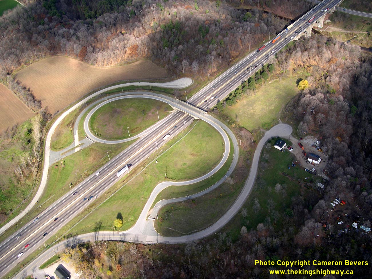 supposed to follow what is now Hwy 407 ETR. Shortly after the Freeman Interchange flyovers were completed, a decision was made to allow the route of Hwy 403 to be