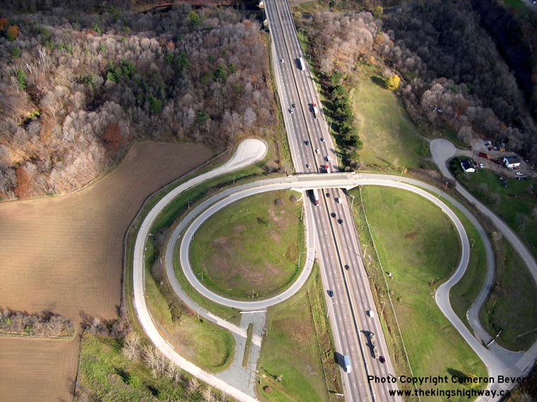 Left - Facing east towards the Freeman Interchange at Hwy 403, Hwy 407 ETR and the Queen Elizabeth Way in Burlington. This massive three-level freeway