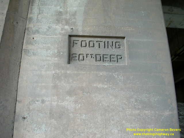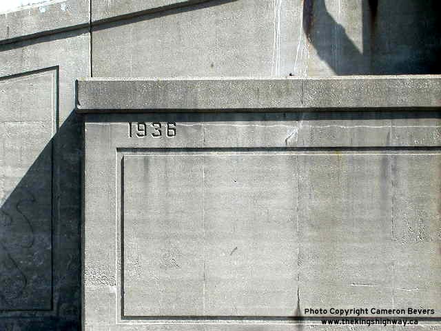 Left - Another view of the double-arch construction of the Bronte Creek Bridge, looking west. (Photograph taken on May 11, 2003 - © Cameron Bevers) Right - Embossed inscription on the northeast wall of the Bronte Creek Bridge, beside Hwy 25. (Photograph taken on May 11, 2003 - © Cameron Bevers)