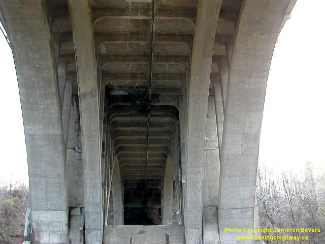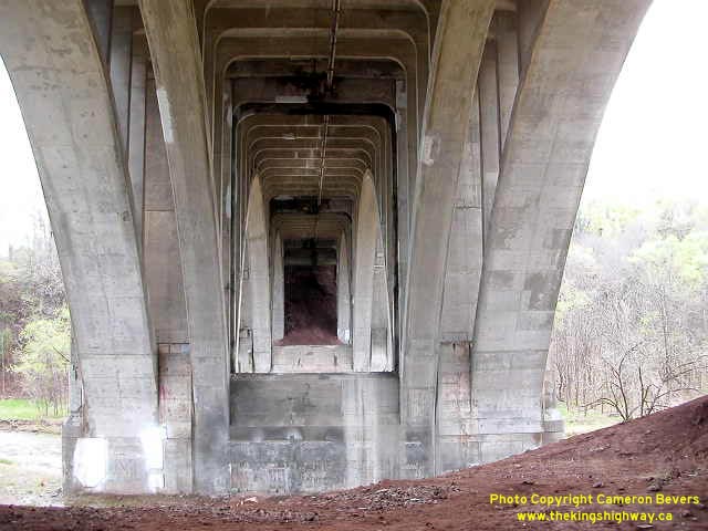 Left - Superstructure of the Hwy 25 Underpass at the Bronte Creek Bridge on the Queen Elizabeth Way. (Photograph taken on May 11, 2003 - © Cameron Bevers) Right - View underneath the Bronte Creek Bridge on the Queen Elizabeth Way. The original four-lane highway bridge was built in 1936, but the structure was widened in 1959 to permit an extra highway lane in each direction. The inside arches are part of the original 1936 structure, the outer arches were added in 1959. (Photograph taken on May 11, 2003 - © Cameron Bevers)