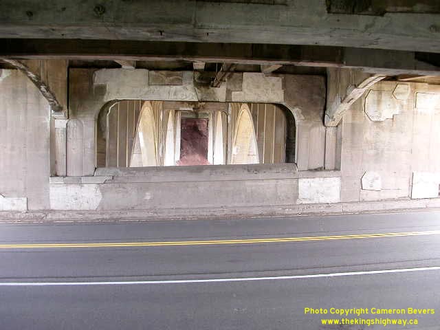 Enlarged Photo Here. (Photograph taken on May 8, 2005 - © Cameron Bevers) Right - Close-up of the eastern side of the Bronte Service Road overpass as seen from the Bronte Creek Bridge. See an Enlarged Photo Here. (Photograph taken on May 8, 2005 - © Cameron Bevers)
