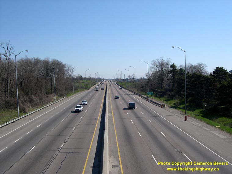 Enlarged Photo Here. (Photograph taken on May 8, 2005 - © Cameron Bevers) Right - Facing west along the Queen Elizabeth Way from the Bronte Service Road interchange. See an Enlarged Photo Here. (Photograph taken on May 8, 2005 - © Cameron Bevers)