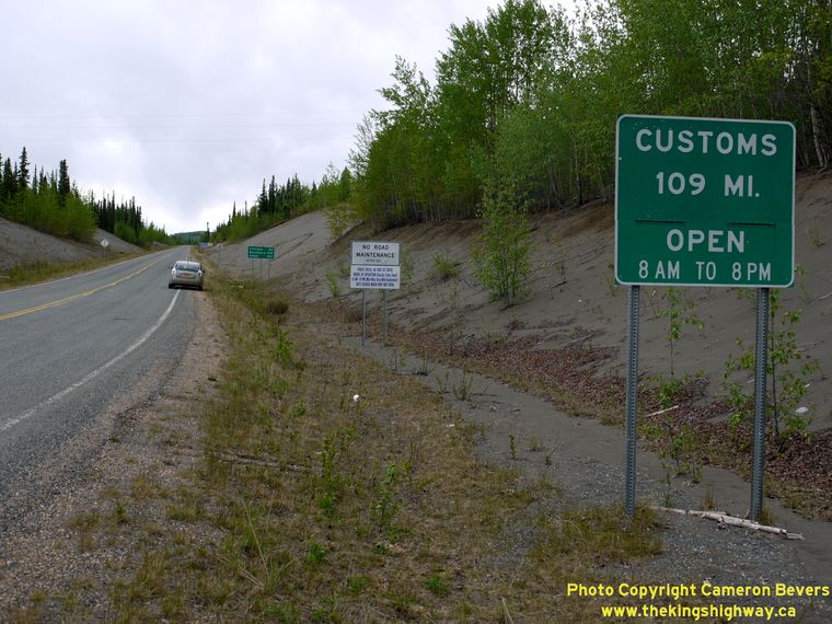 winter, and is closed to traffic seasonally. See an Enlarged Photo Here. (Photograph taken on June 2, 2012 - © Cameron Bevers) Right - Sign showing the highway distance to the International Border at Poker Creek, on the Top of the World Highway west of Dawson City. The Poker Creek Border Crossing is the northernmost highway crossing between Canada and the United States. It is only open from 8:00 am to 8:00 pm daily. This seasonal border crossing is closed in winter. See an Enlarged Photo Here. (Photograph taken on June 2, 2012 - © Cameron Bevers)