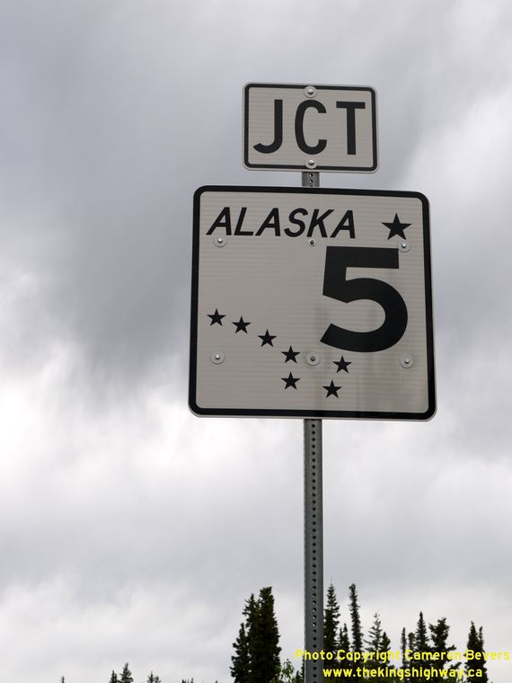 Enlarged Photo Here. (Photograph taken on June 8, 2012 - © Cameron Bevers) Right - Junction sign approaching the Hwy 5 Junction on the Northbound Alaska Highway (Hwy 2) at Tetlin Junction. This is the first state highway junction in Alaska, when heading northbound along the Alaska Highway from Canada. See an Enlarged Photo Here. (Photograph taken on June 8, 2012 - © Cameron Bevers)