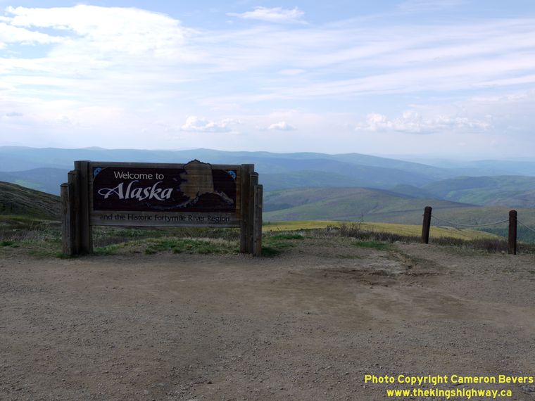 Left - Welcome to Alaska Sign at a scenic lookout on the Top of the World Highway at Poker Creek. The International Boundary between the United States and