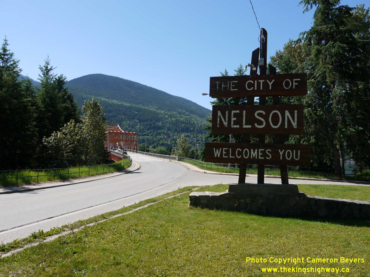 Enlarged Photo Here. (Photograph taken on June 12, 2017 - © Cameron Bevers) Right - Welcome to Nelson entrance sign on westbound Hwy 3A. The signature orange Nelson Bridge can be seen in the background. See an Enlarged Photo Here. (Photograph taken on June 12, 2017 - © Cameron Bevers)
