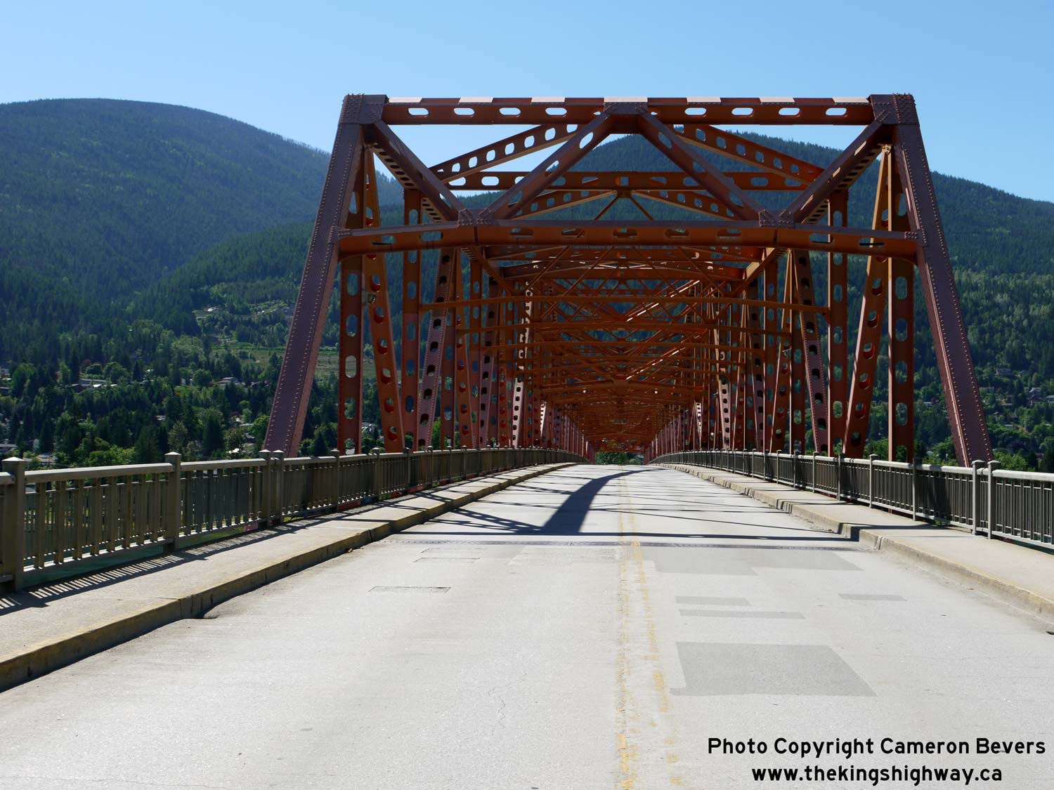 Left - View of the western side of the Nelson Bridge on Hwy 3A from the north shore. The centre section of the Nelson Bridge is a cantilevered through truss