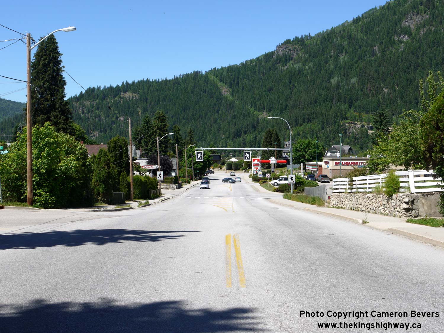 Left - Facing west along Anderson Street (Hwy 3A) through Nelson. Near the Petro-Canada Station in the background, Anderson Streets curves to the left and