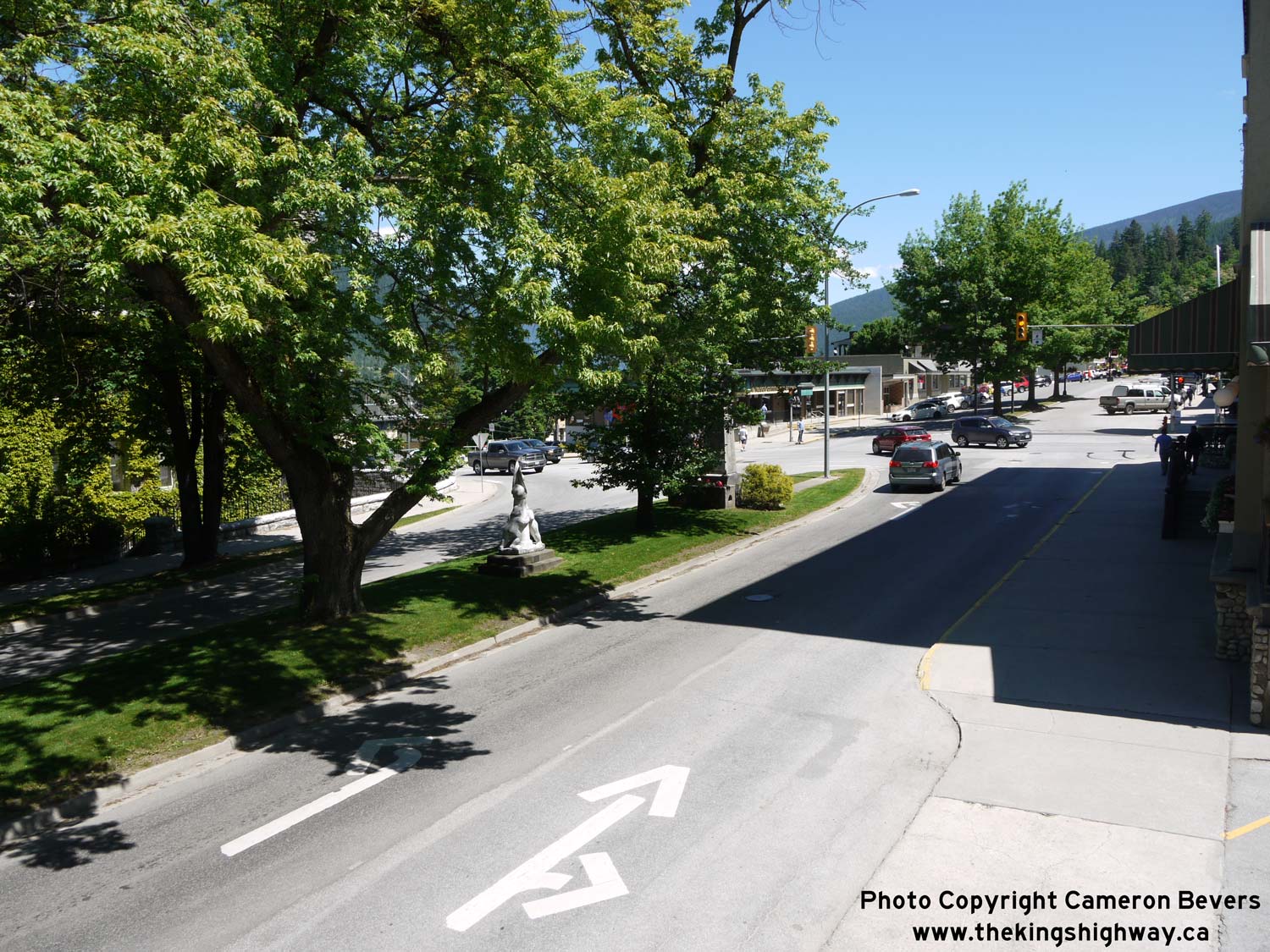 Enlarged Photo Here. (Photograph taken on June 12, 2017 - © Cameron Bevers) Right - Facing east along tree-lined Vernon Street (Hwy 3A) approaching Ward Street. Hwy 3A turns left onto Ward Street as it heads east towards the Kootenay Lake Ferry. See an Enlarged Photo Here. (Photograph taken on June 12, 2017 - © Cameron Bevers)