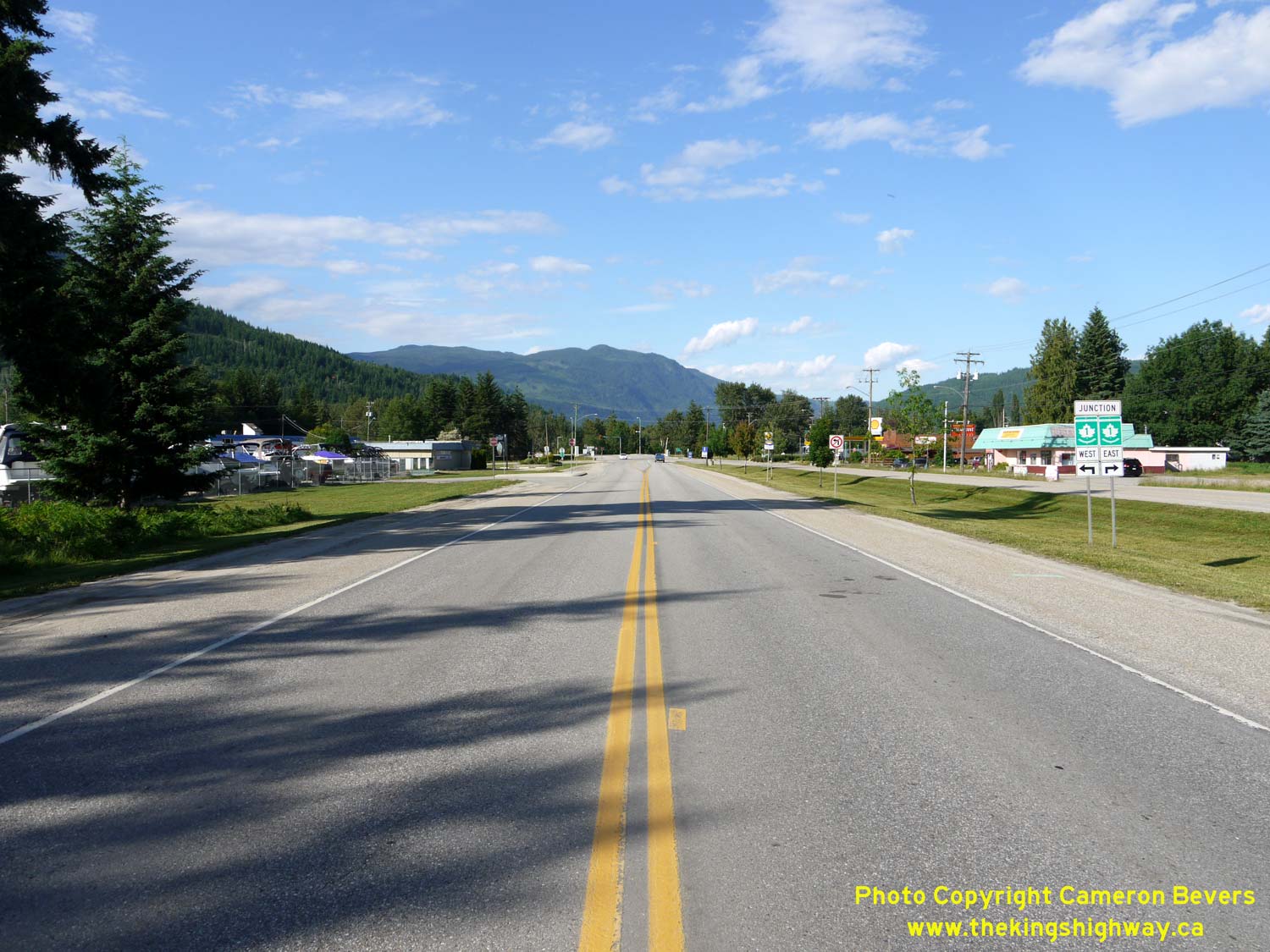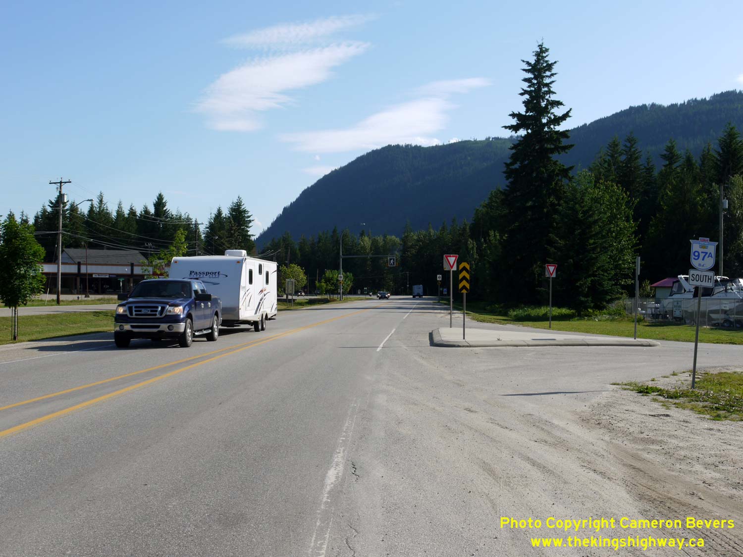 Left - Facing south along Hwy 97A near the Hwy 1 Junction in Sicamous in 2015. The route of Hwy 97A begins at the Hwy 1 Junction and heads south towards