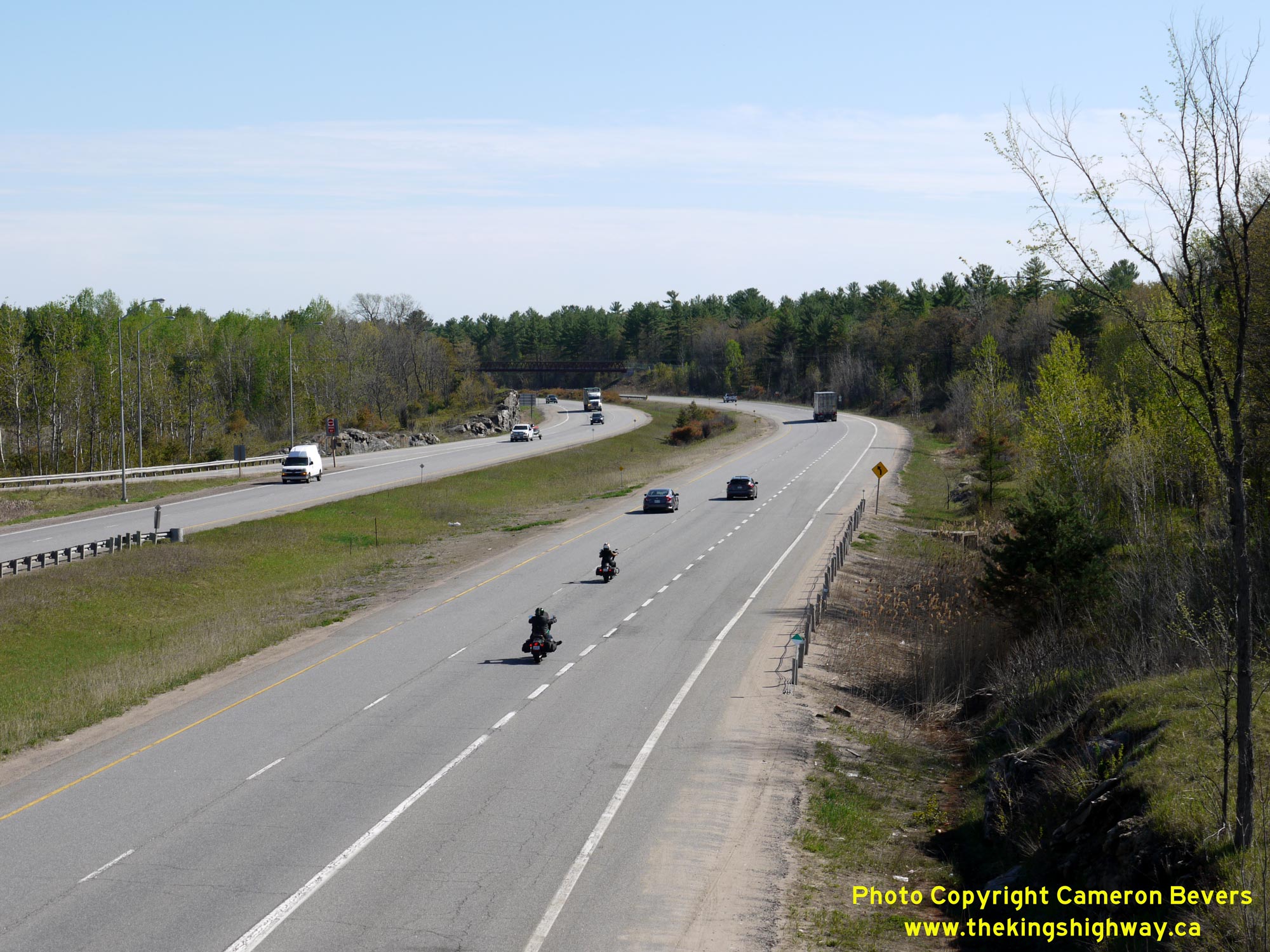 ![]() Left - Facing north along the southbound lanes of Hwy 11 from the Hwy 117 Overpass near Bracebridge. The Muskoka River (North Branch) Bridge can be seen in