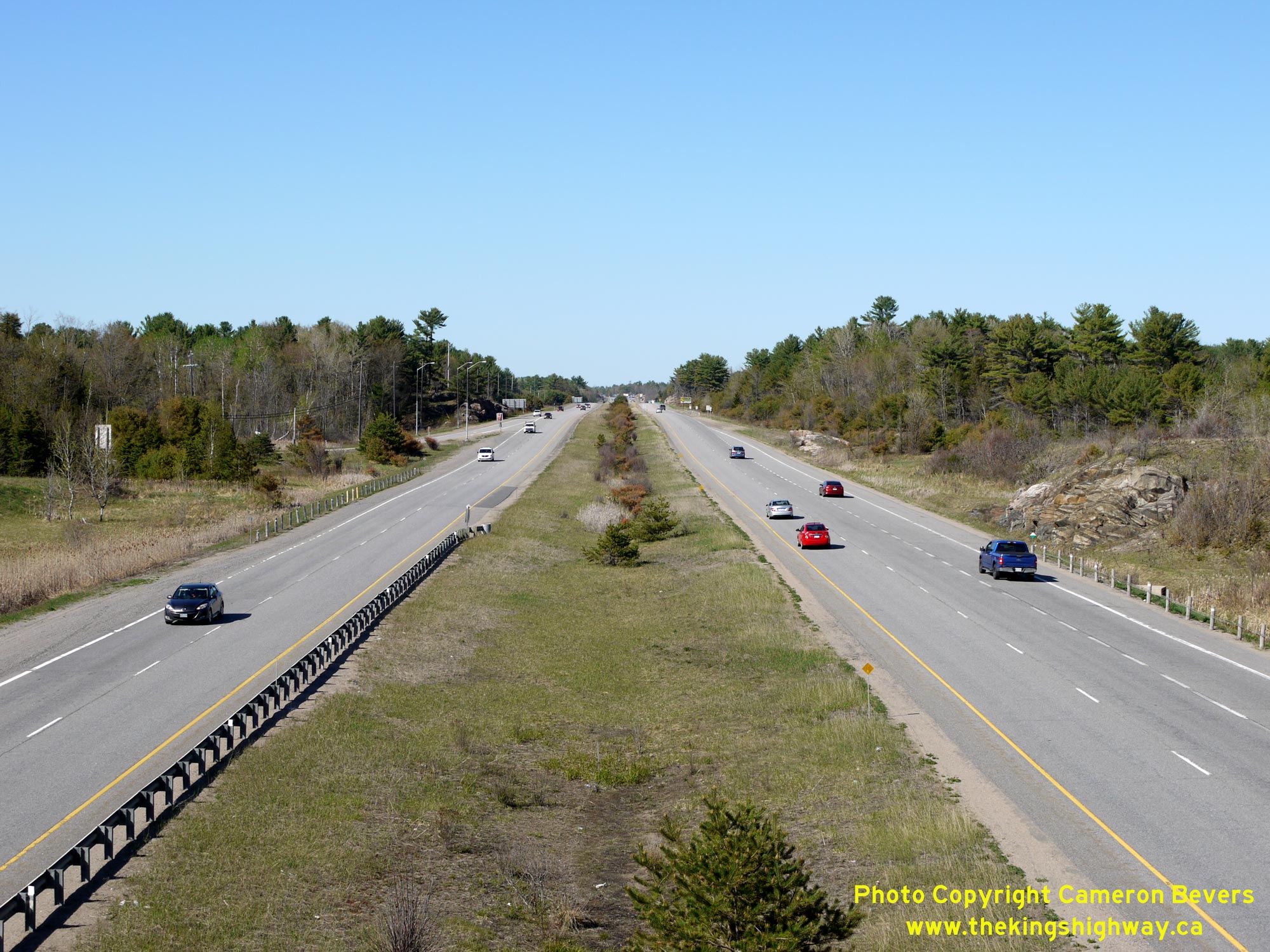 Enlarged Photo Here.(Photograph taken on May 22, 2020 - © Cameron Bevers) Right - View of Hwy 11 about 2 km south of the Hwy 118 Interchange between Gravenhurst and Bracebridge. In May 1949, a contract was called by the DHO for the