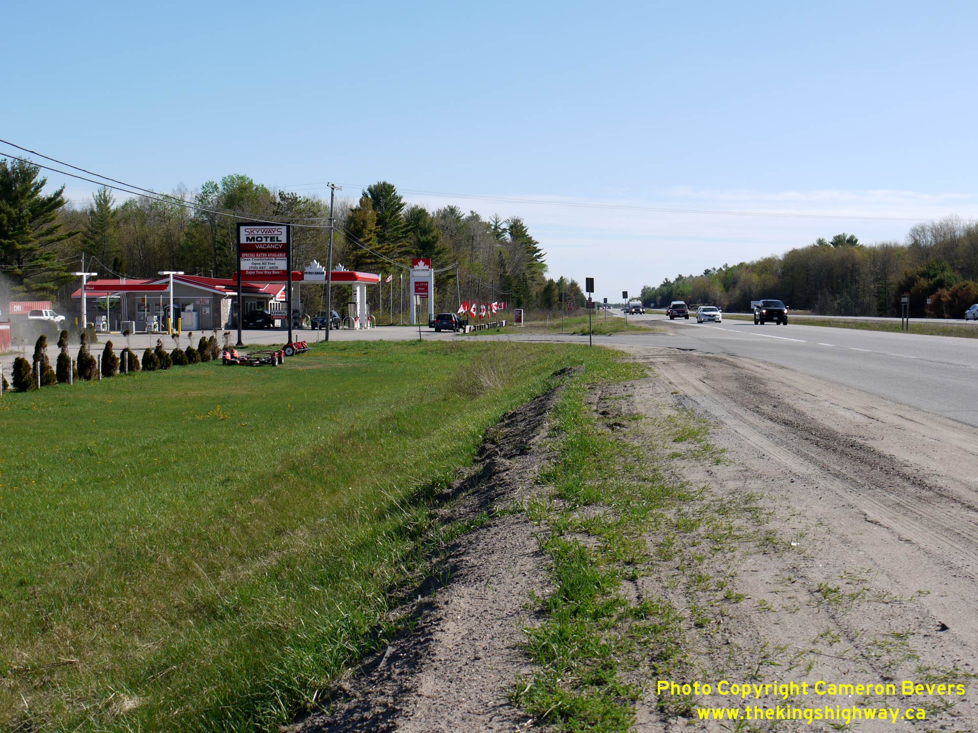 stations in Ontario in April 2020. See an Enlarged Photo Here.(Photograph taken on May 22, 2020 - © Cameron Bevers) Right - Facing south along Hwy 11 at the Skyways Motel and Restaurant. At the time Hwy 11 was expanded from two to four lanes in the early 1970s, this