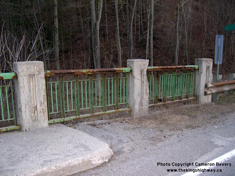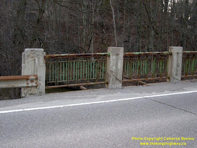 Left - Facing north towards Tillsonburg along Hwy 19 at the Otter Creek Bridge. (Photograph taken on April 7, 2004 - © Cameron Bevers) Right - Close-up of the embossed concrete railing design on the Otter Creek Bridge. This embossed pattern was used on the concrete handrails of numerous Ontario provincial highway bridges constructed between 1934 and 1936. (Photograph taken on April 7, 2004 - © Cameron Bevers)